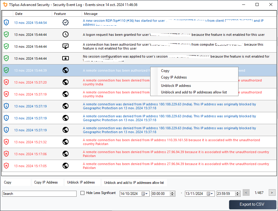 TSplus Advanced Security automatically stops the attack and quarantines the affected programs and files. Administrators can review the list of quarantined items and decide to whitelist specific entries.